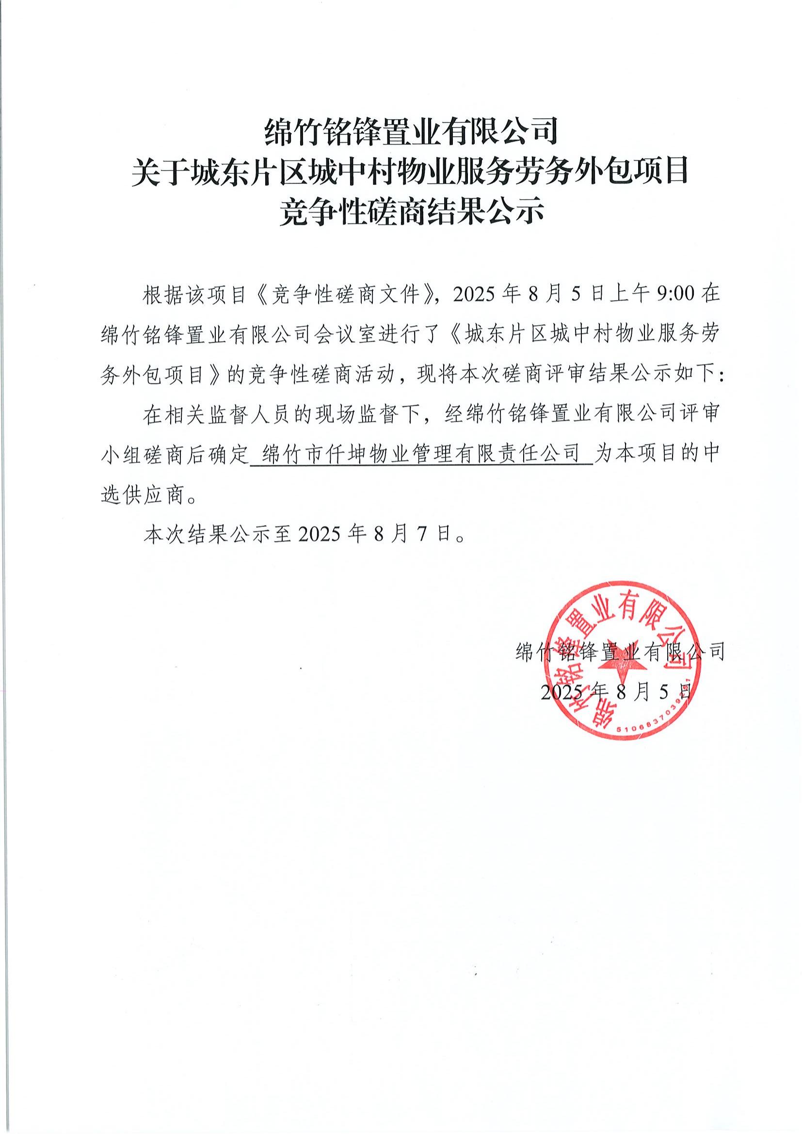 关于城东片区城中村物业服务劳务外包项目磋商结果公示
