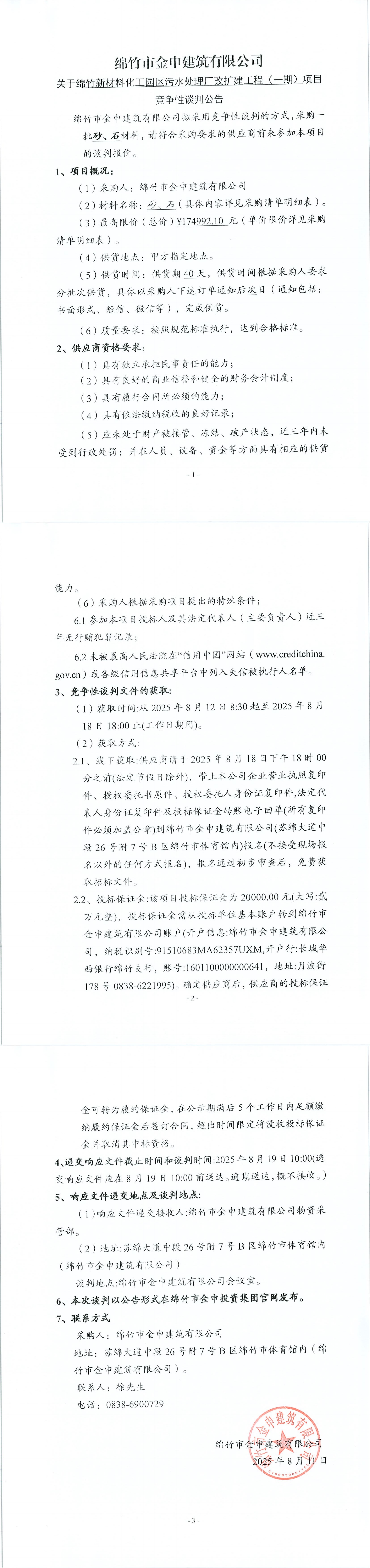 新材料污水处理厂(砂、石)竞争性谈判公告