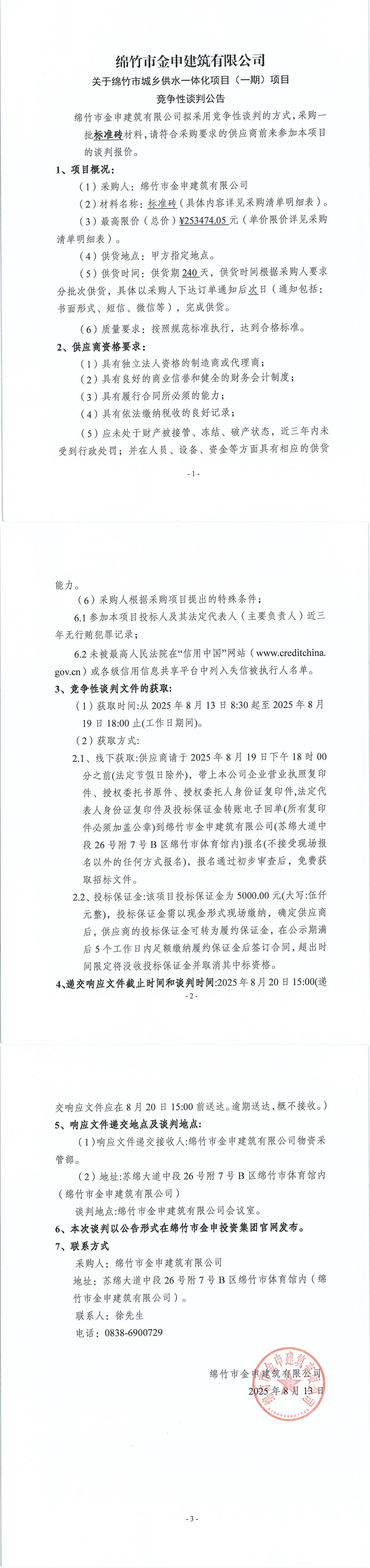 城乡供水一期(标准砖)竞争性谈判公告