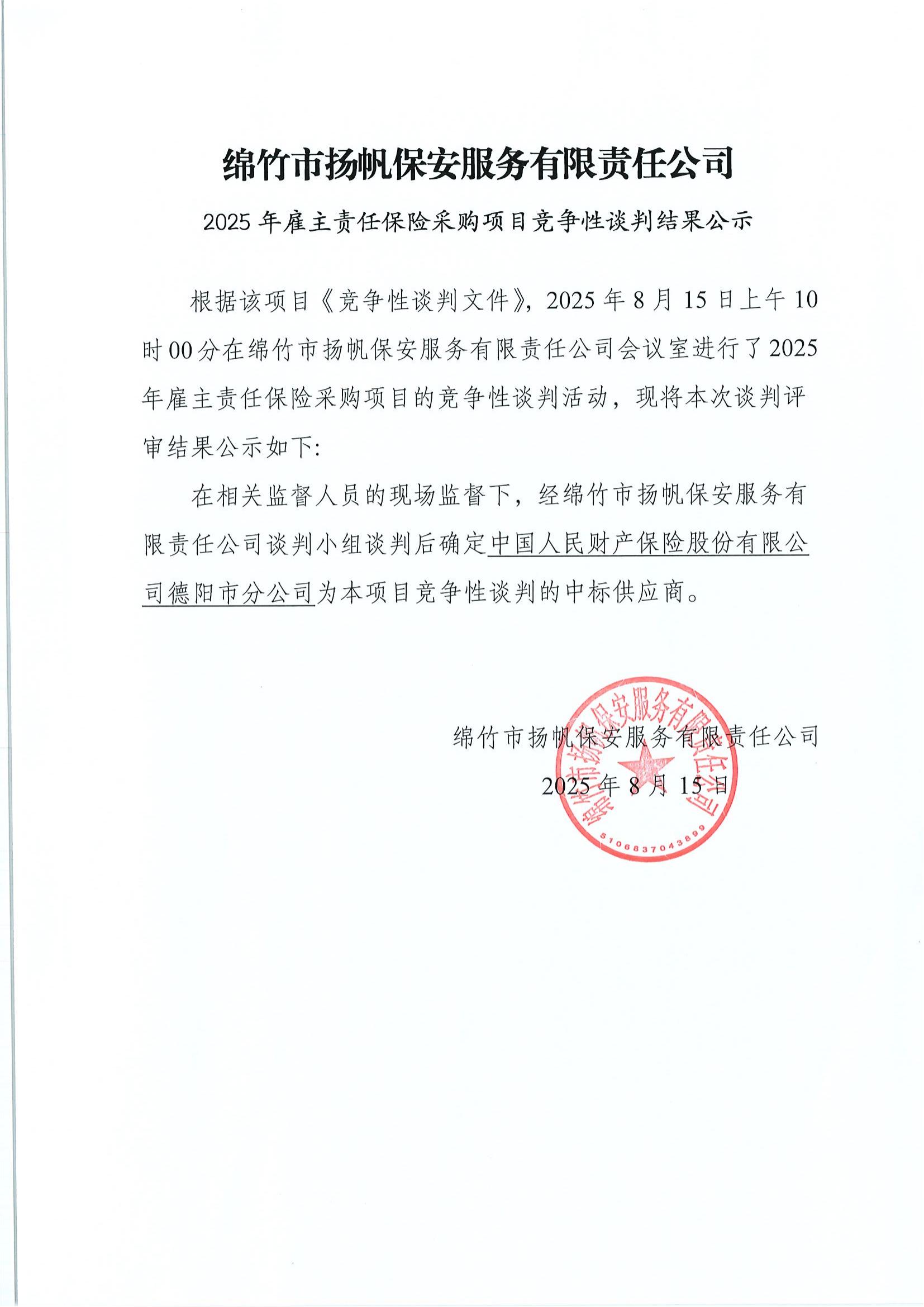 2025年雇主责任保险采购项目竞争性谈判结果公示