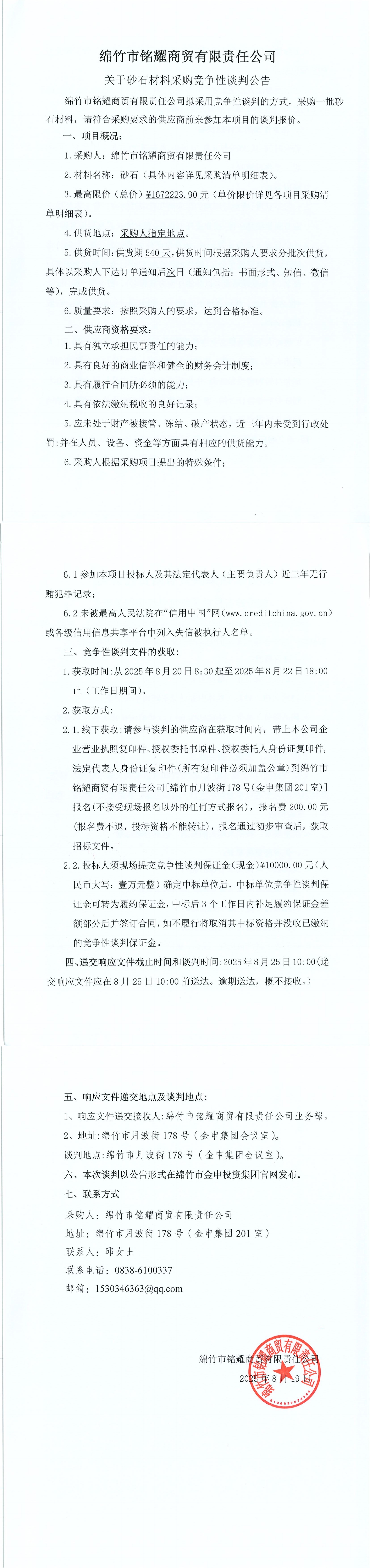 铭耀商贸关于砂石材料采购竞争性谈判公告