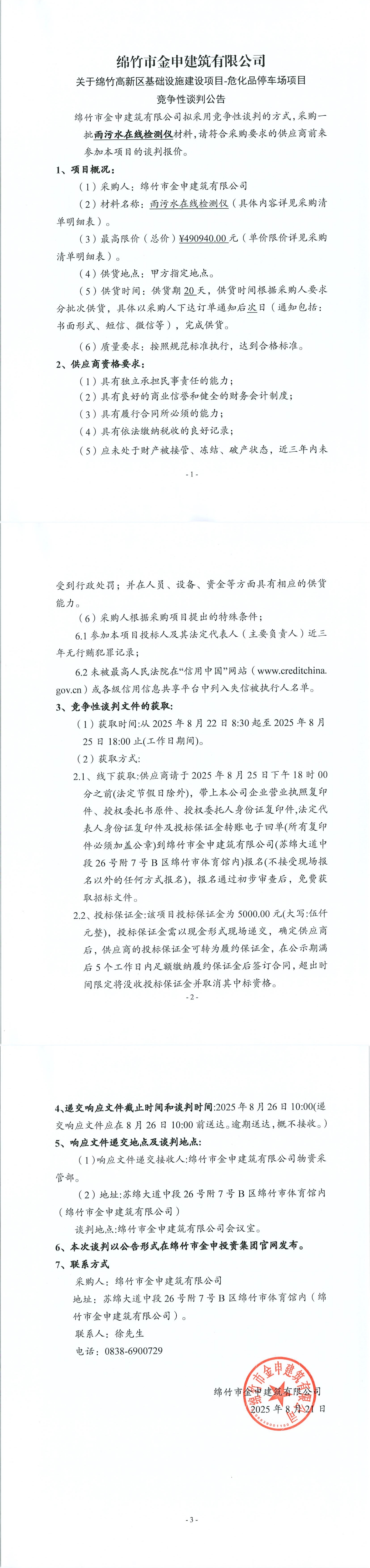 危化品停车场项目(雨污水在线检测仪)竞争性谈判公告