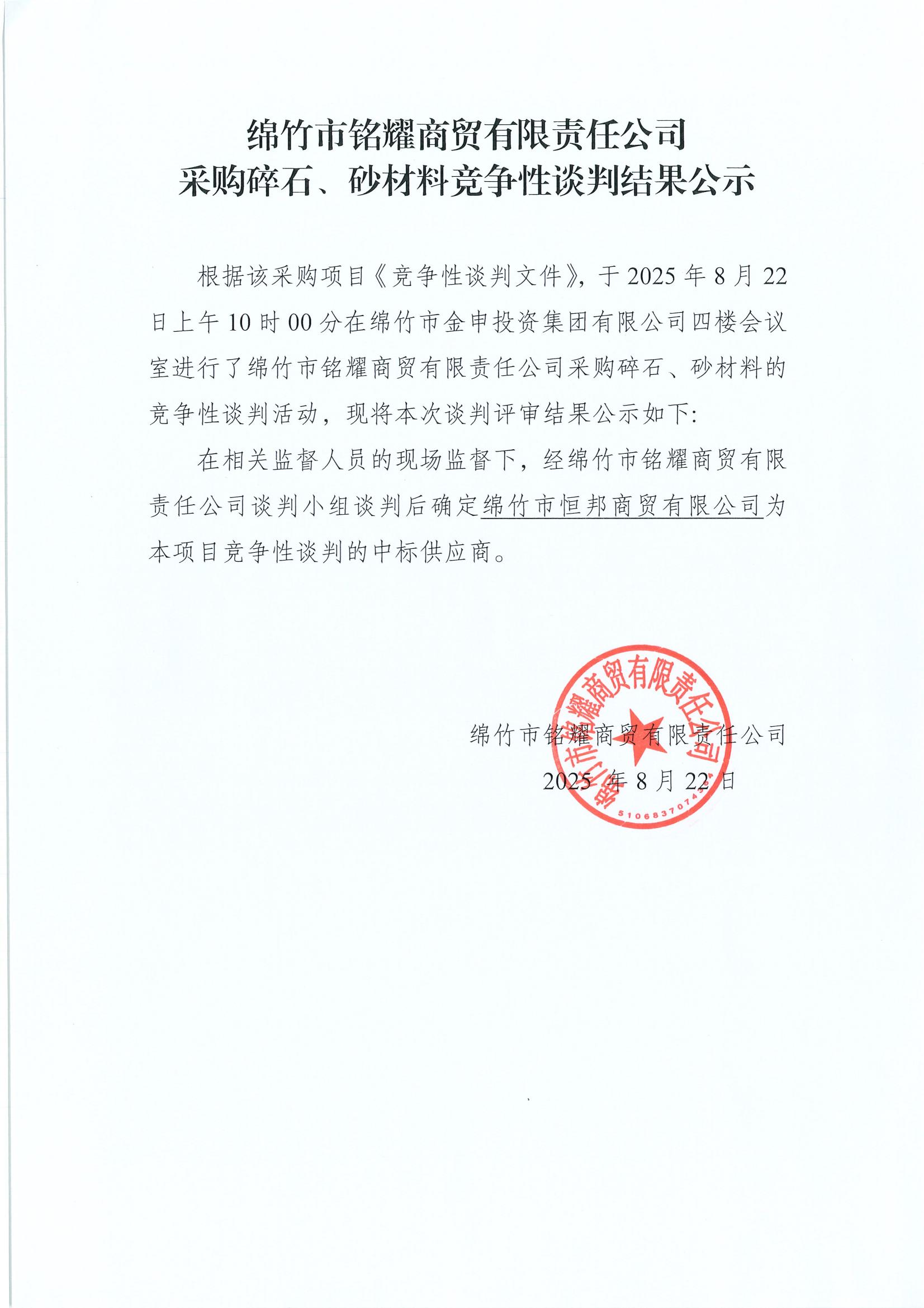 铭耀商贸采购碎石、砂材料竞争性谈判结果公示