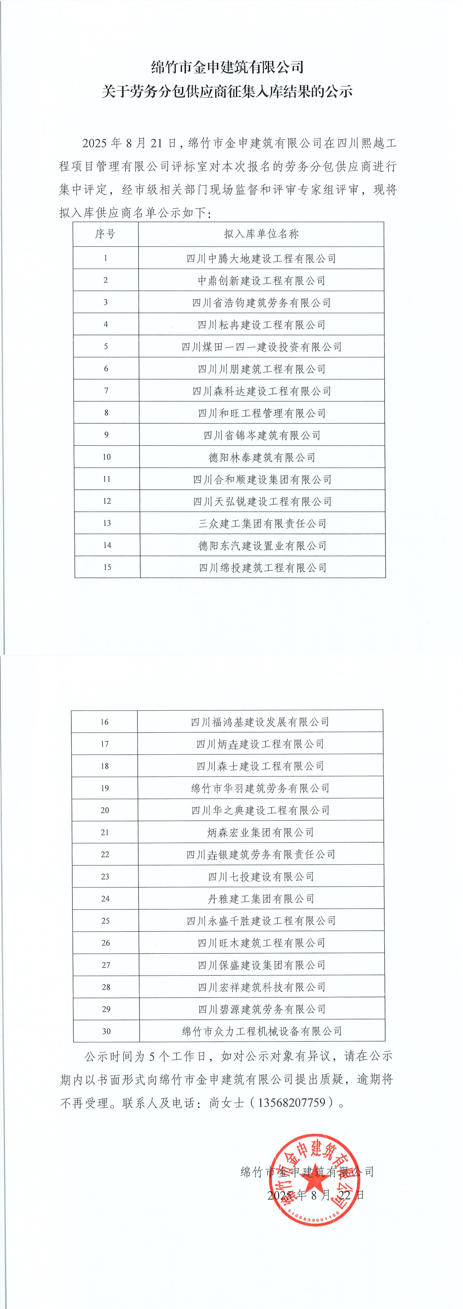 绵竹市金申建筑有限公司劳务分包供应商征集入库结果公示