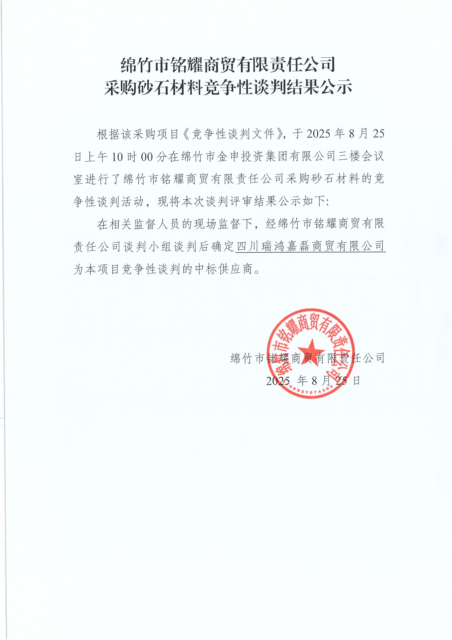铭耀商贸采购砂石材料竞争性谈判结果公示