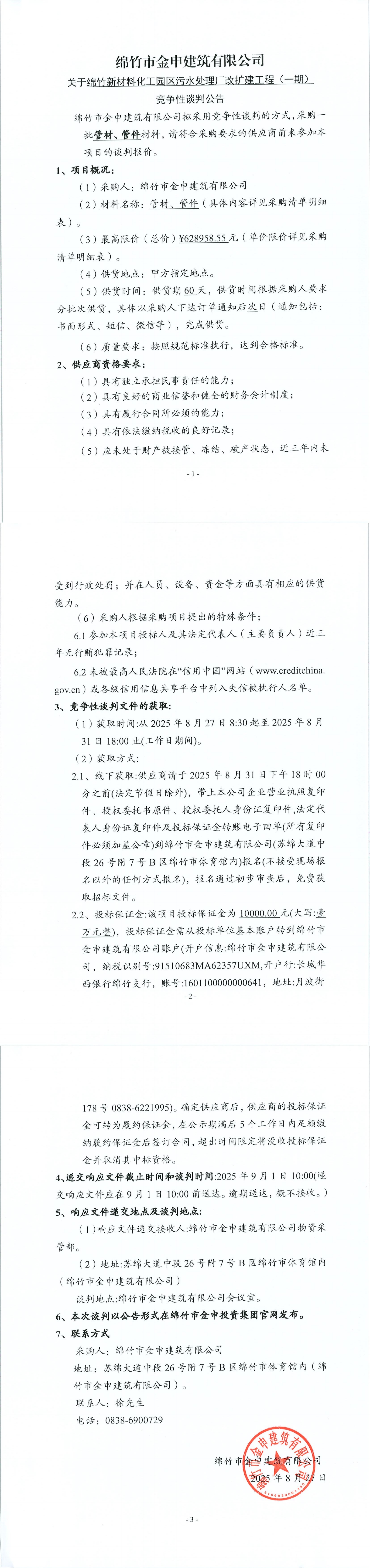 污水处理厂一期(管材、管件)材料采购竞争性谈判公告