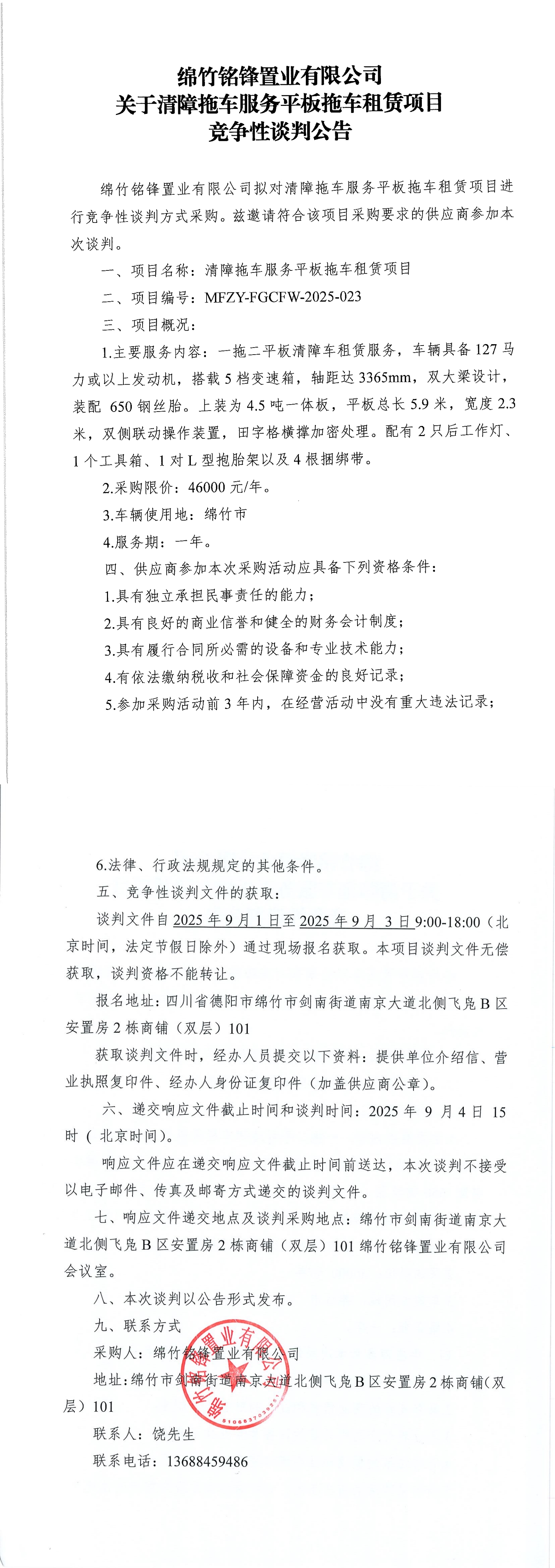 清障拖车服务平板拖车租赁项目竞争性谈判公告