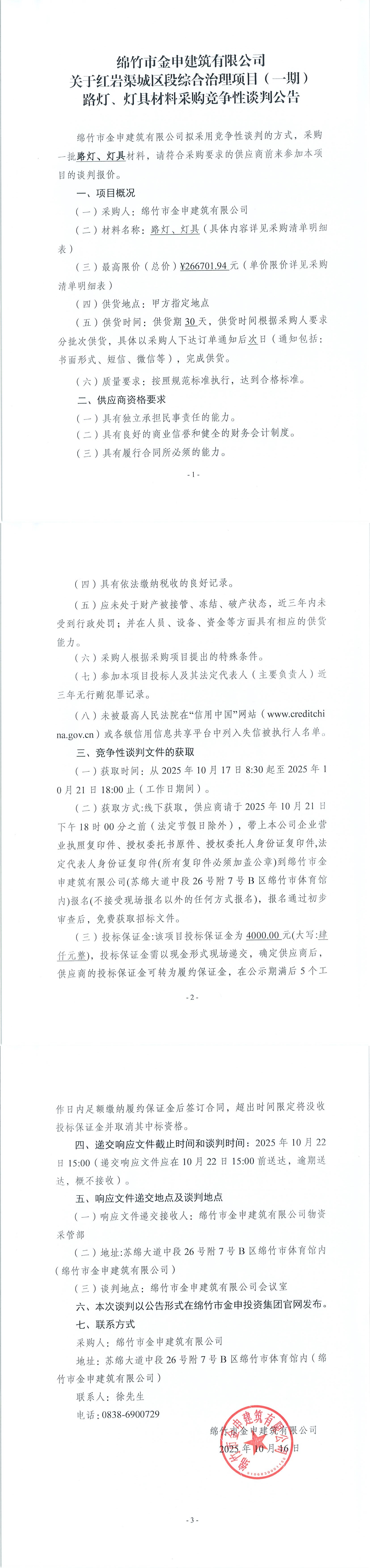 关于红岩渠一期(路灯、灯具)材料采购竞争性谈判公告