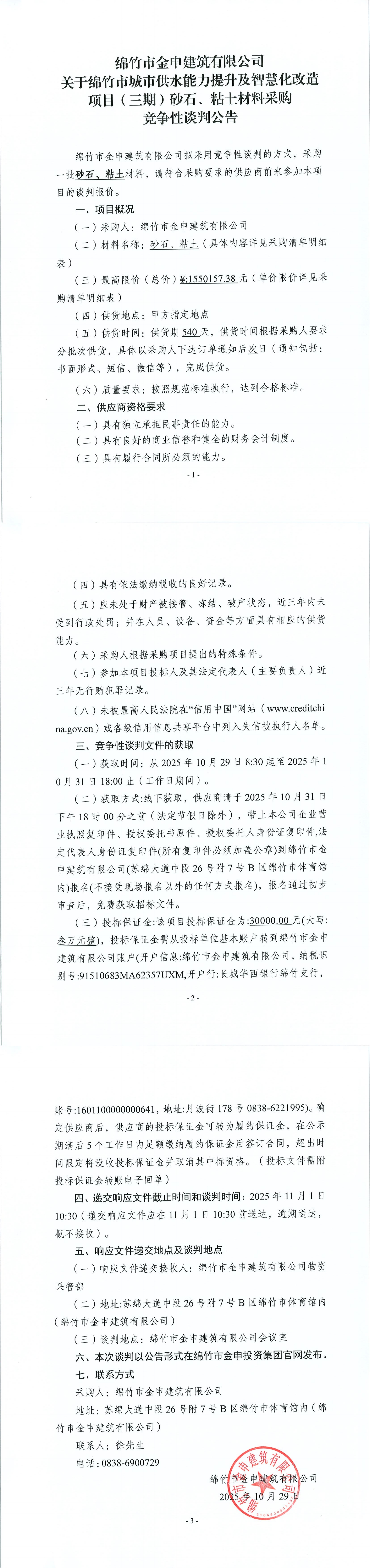关于城市供水三期(砂石、粘土)材料采购竞争性谈判公告
