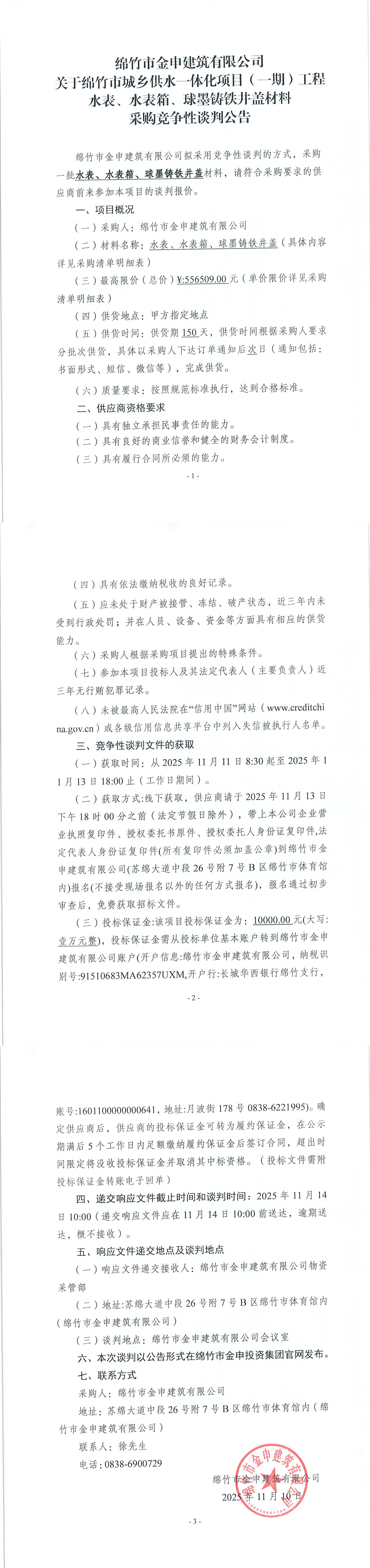 关于绵竹市城乡供水一期(水表、水表箱、球墨铸铁井盖)材料采购竞争性谈判公告