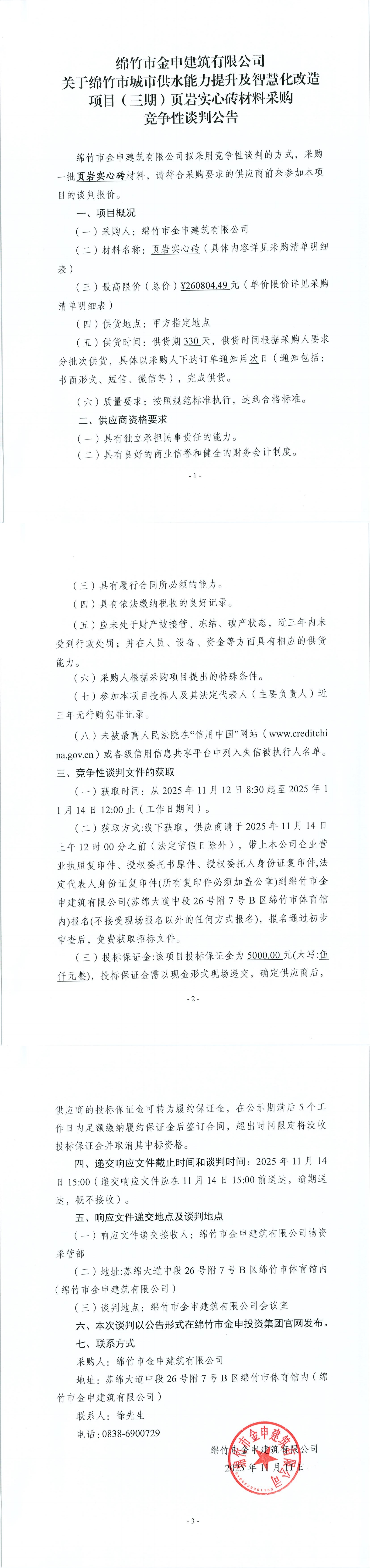 关于绵竹市城市供水三期(页岩实心砖)第二次材料采购竞争性谈判公告