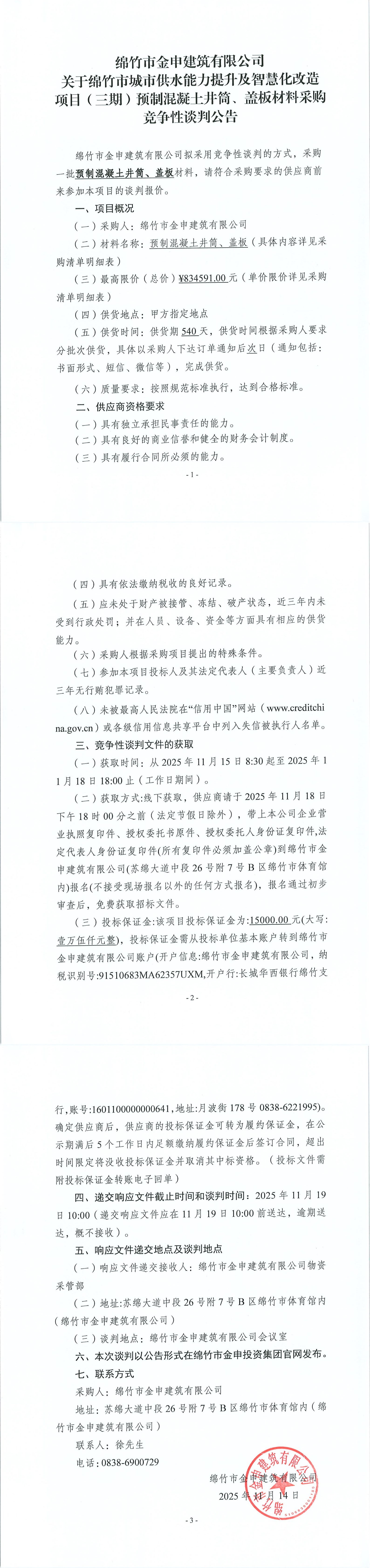 关于城市供水三期(预制混凝土井筒、盖板)材料采购竞争性谈判公告