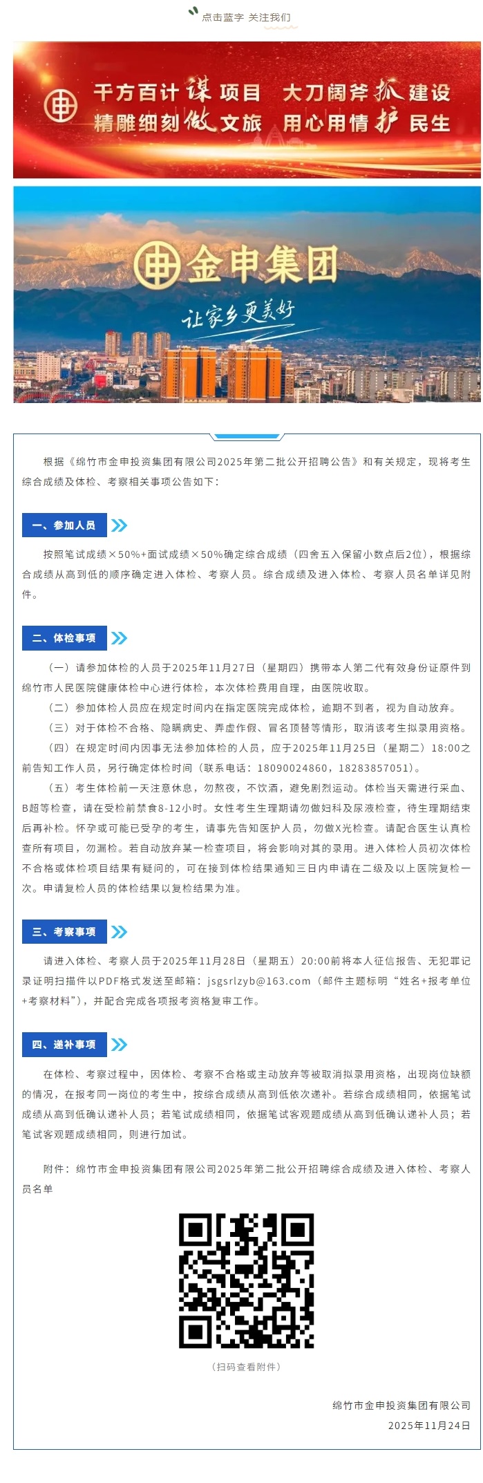 绵竹市金申投资集团有限公司2025年第二批公开招聘综合成绩及进入体检、考察人员名单公告