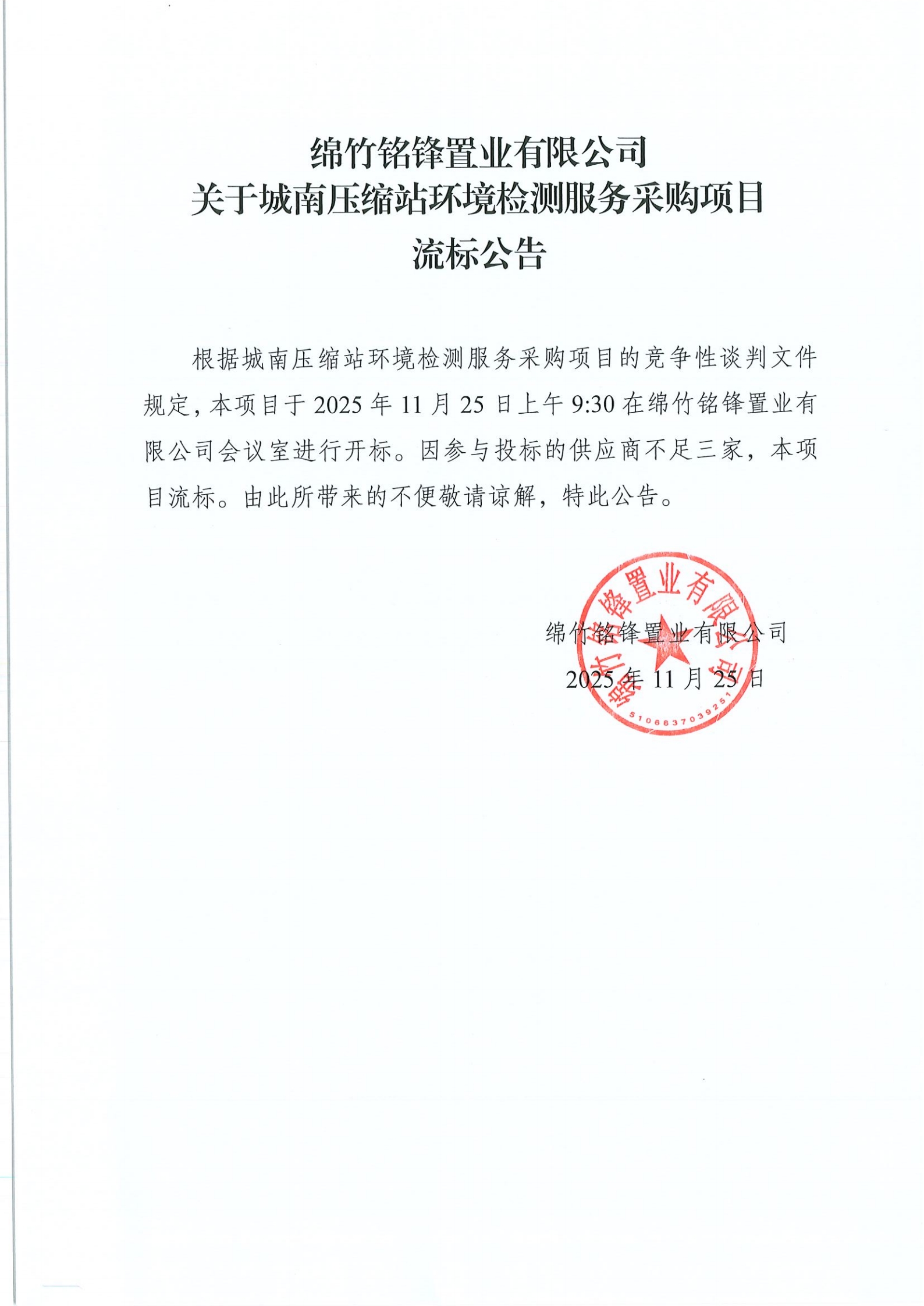 关于城南压缩站环境检测服务采购项目流标公告