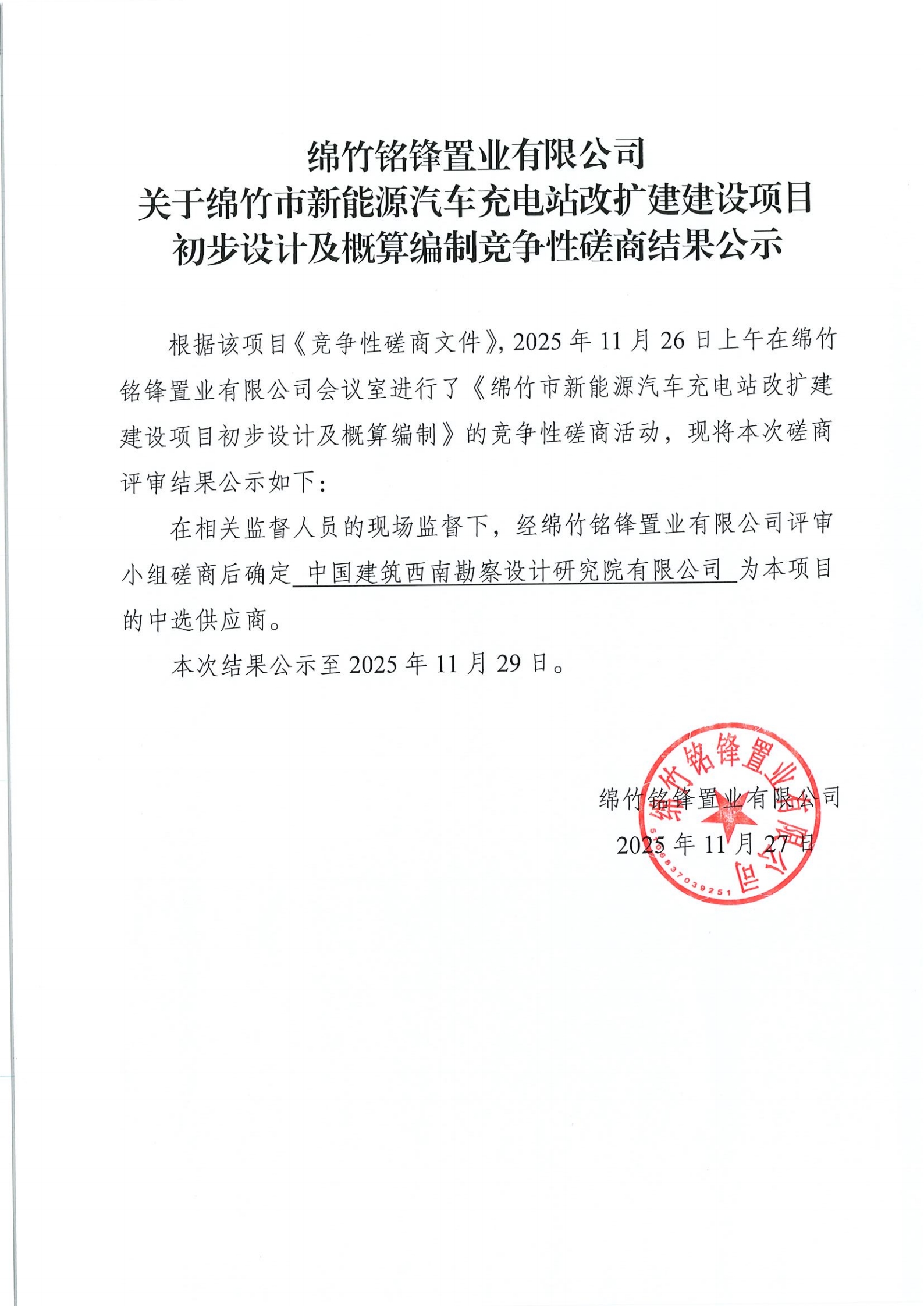 关于绵竹市新能源汽车充电站改扩建建设项目初步设计及概算编制竞争性磋商结果公示
