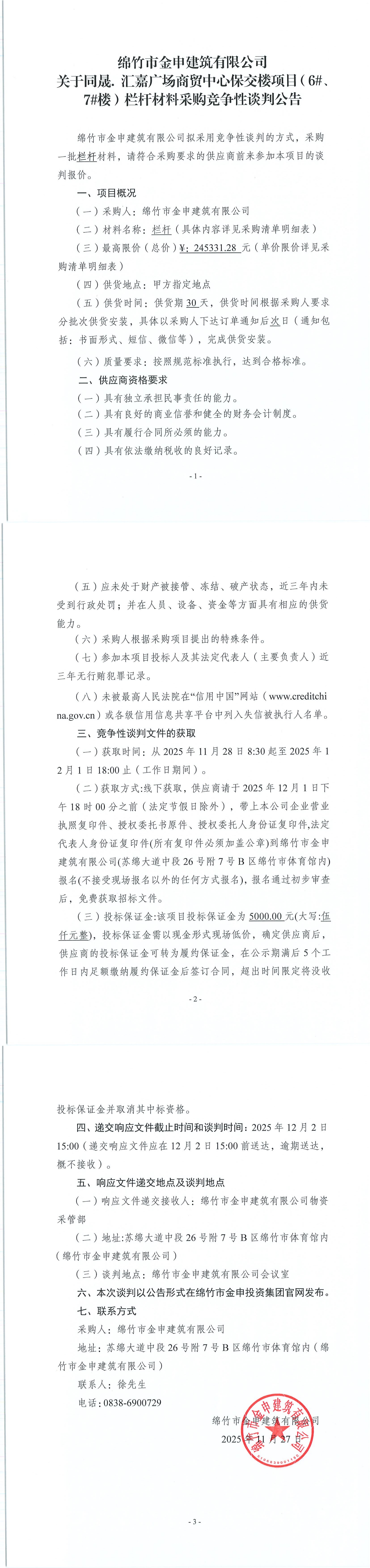 关于同晟.汇嘉广场商贸中心保交楼项目(6#、7#楼)栏杆材料采购竞争性谈判公告