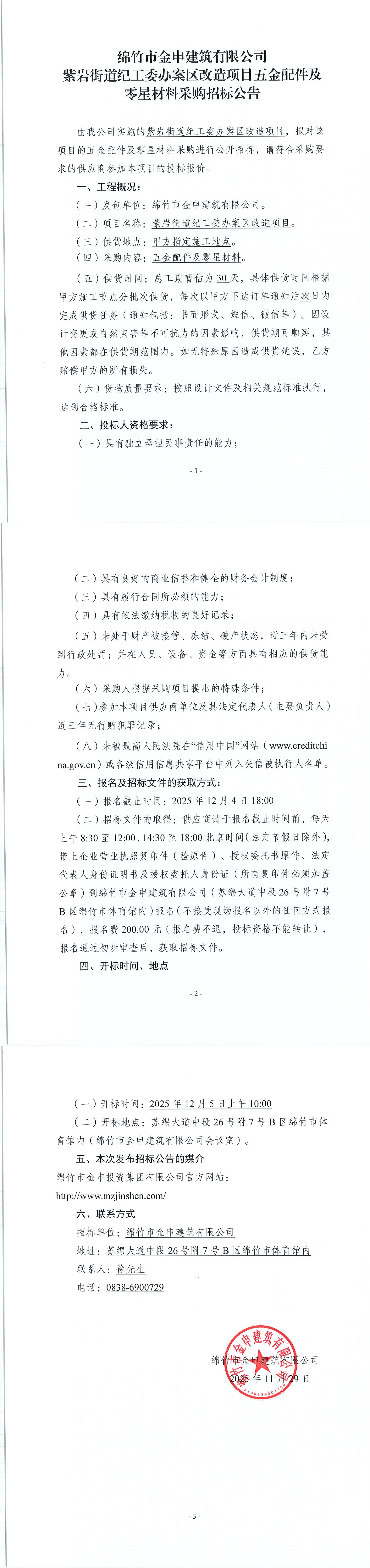 紫岩街道纪工委办案区改造项目五金配件及零星材料采购招标公告