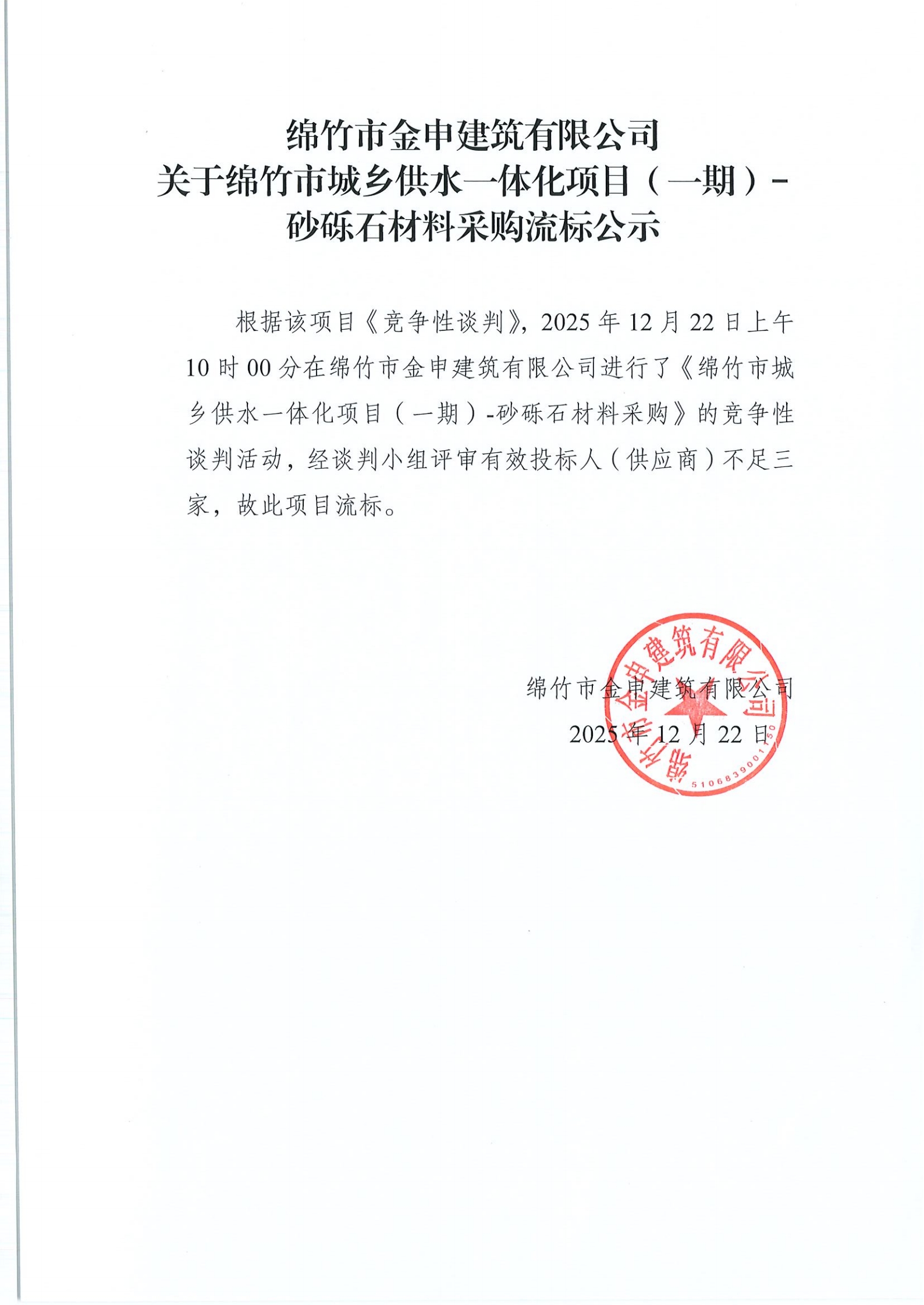 金申建筑关于绵竹市城乡供水一体化项目(一期)-砂砾石材料采购流标公示