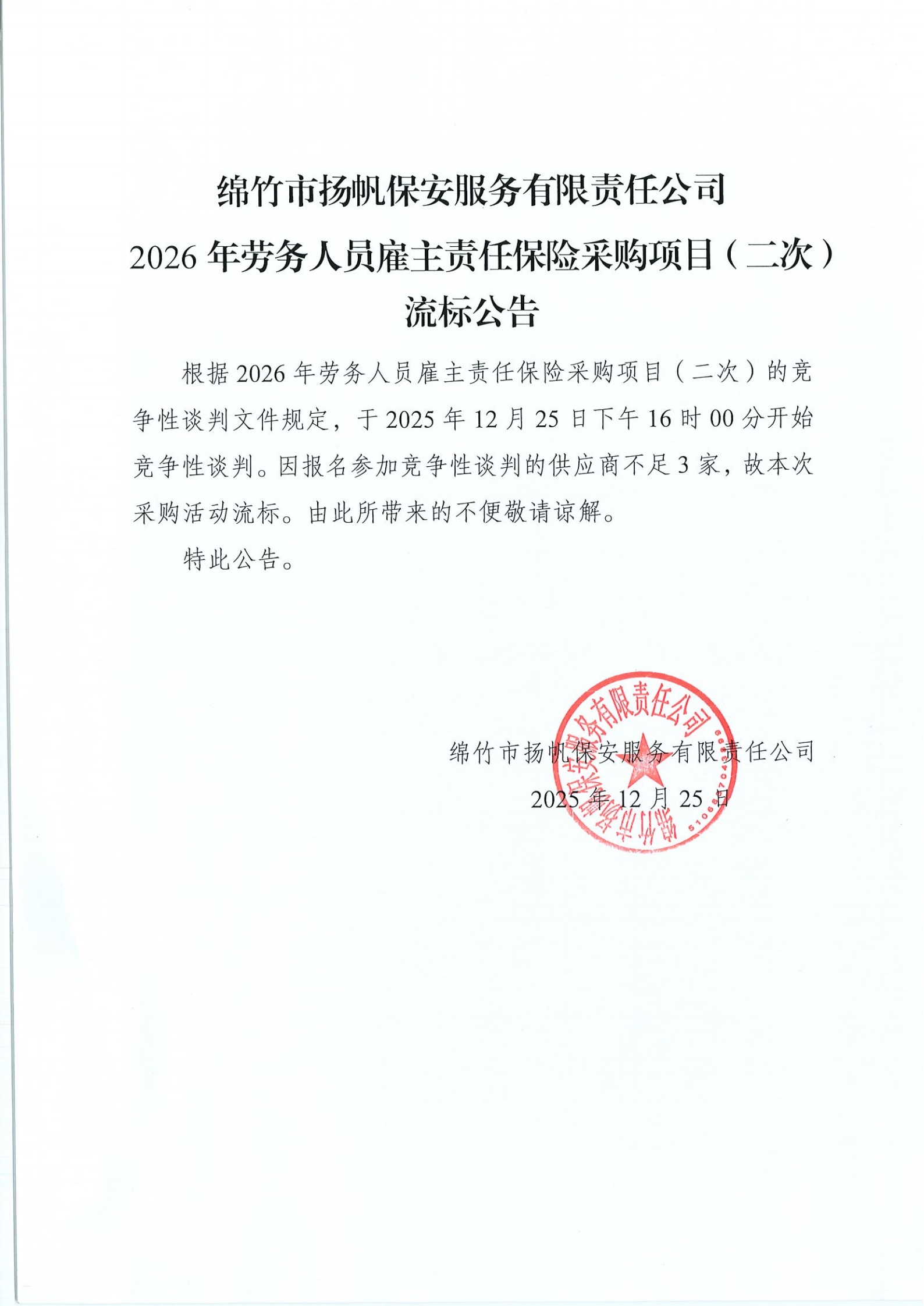 扬帆保安2026年劳务人员雇主责任保险采购项目(二次) 流标公告