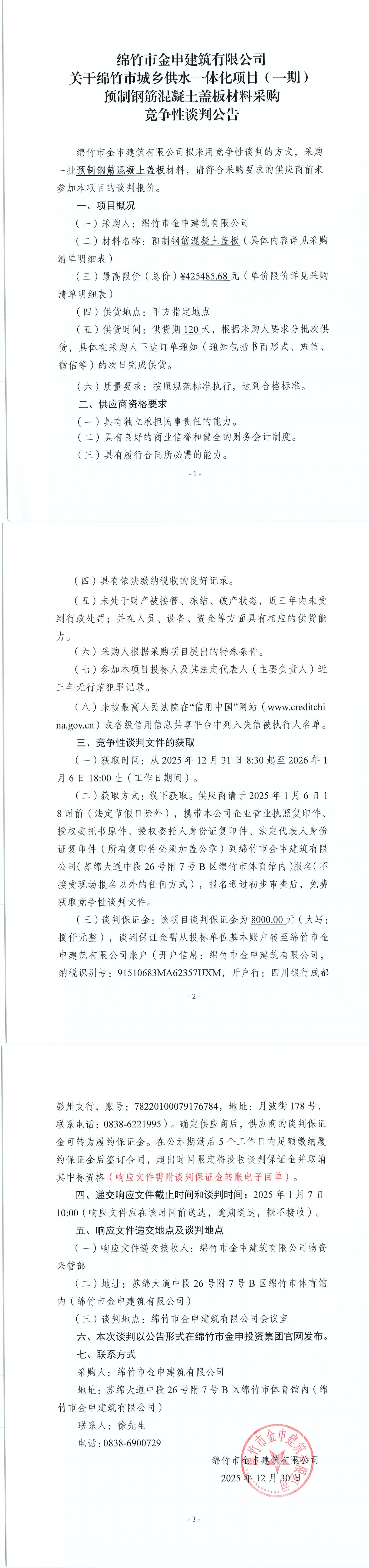 金申建筑关于城乡供水一期预制钢筋混凝土盖板材料采购竞争性谈判公告