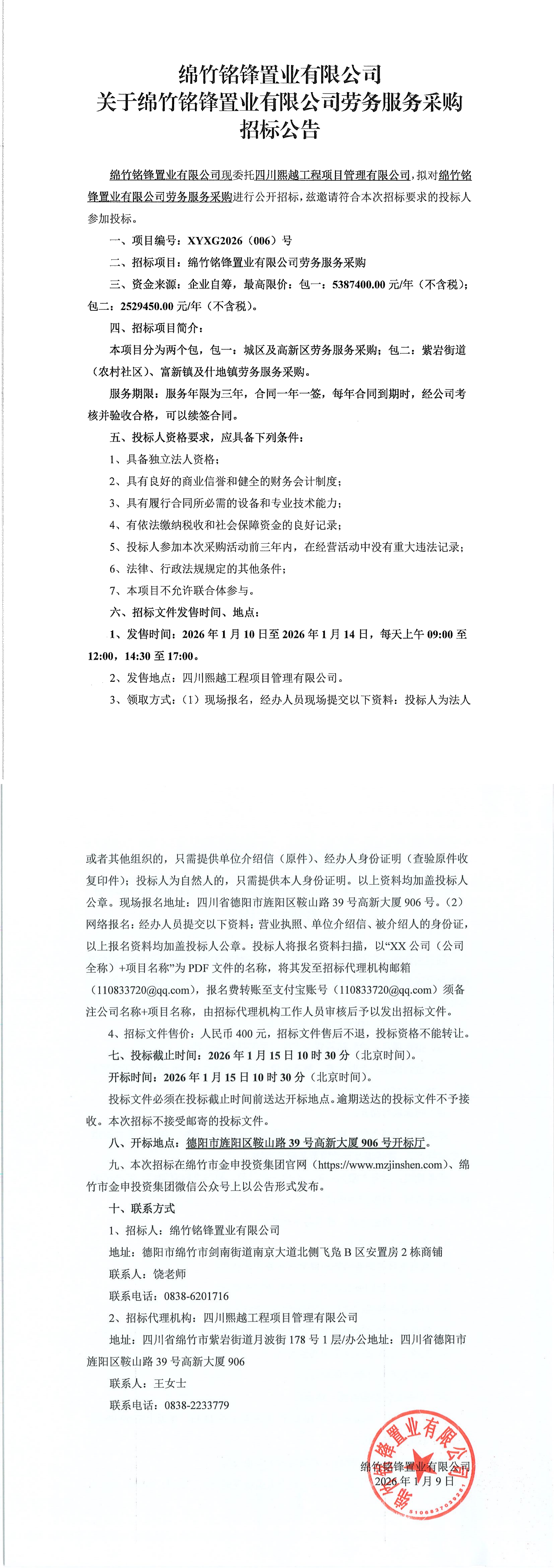 绵竹铭锋置业有限公司劳务服务采购招标公告