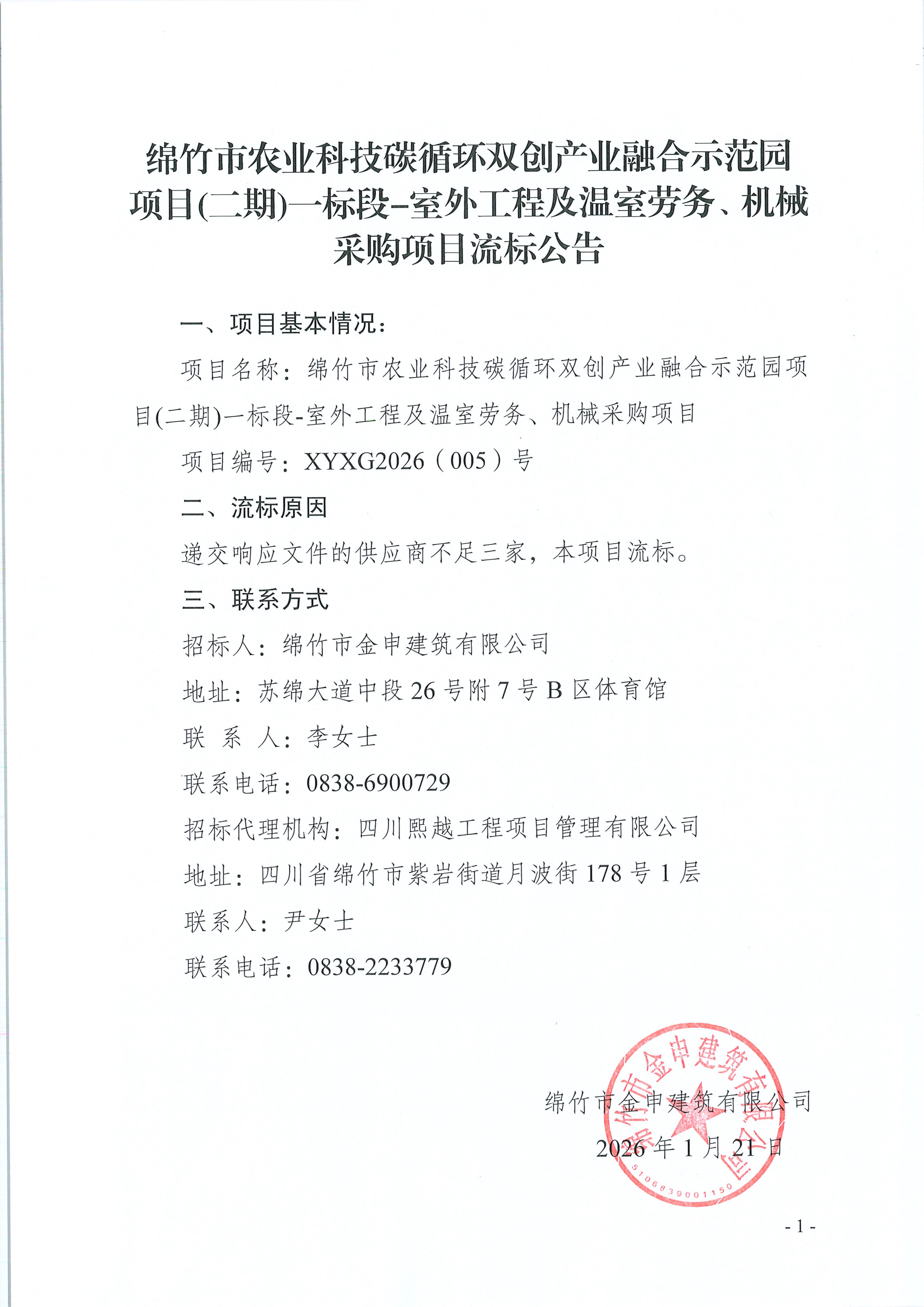 市农业科技碳循环双创产业融合示范园项目(二期)一标段-室外工程及温室劳务、机械采购项目流标公告