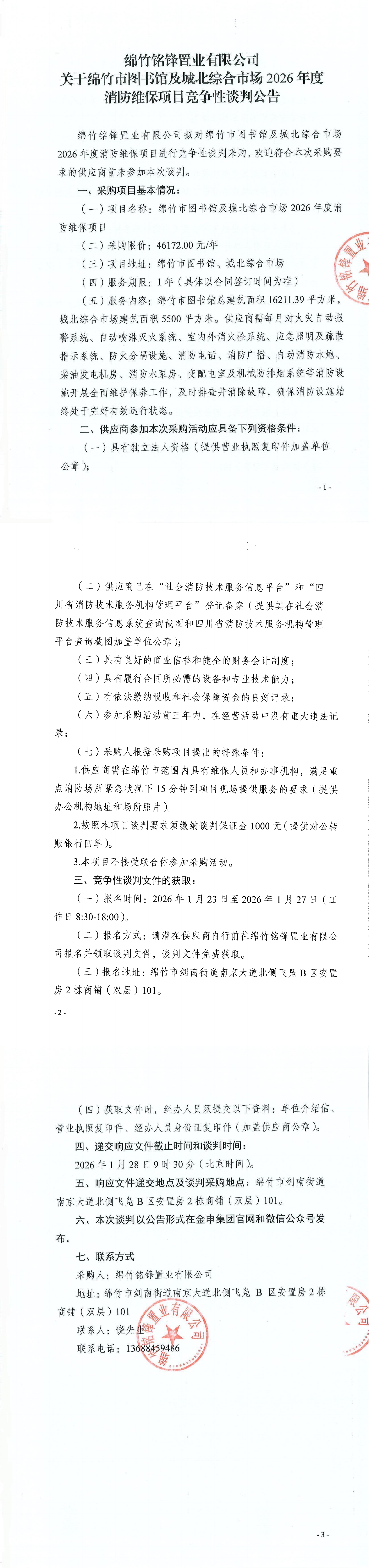绵竹市图书馆及城北综合市场2026年度消防维保项目竞争性谈判公告