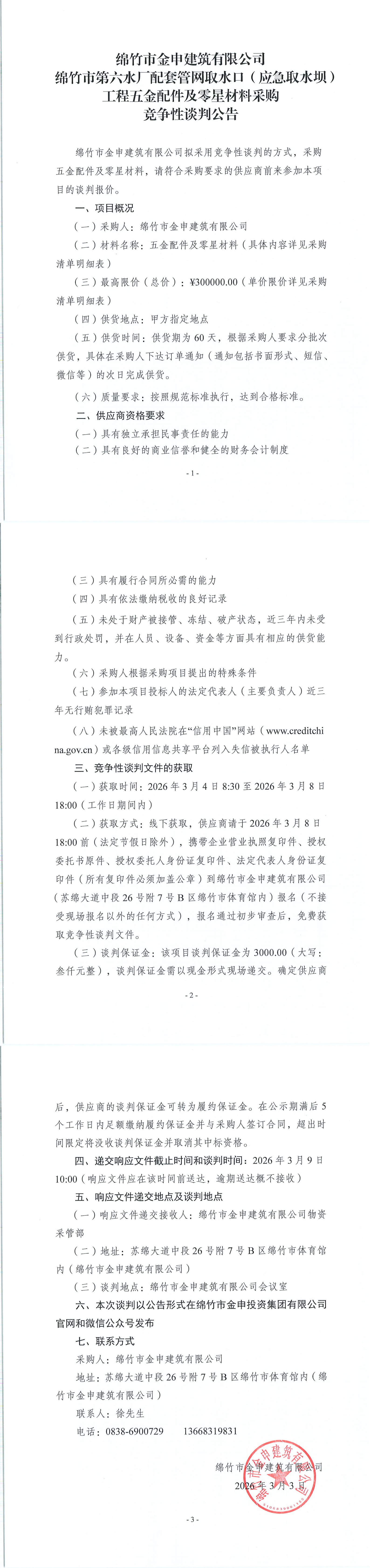 金申建筑关于绵竹市第六水厂(应急取水坝)五金配件及零星材料采购竞争性谈判公告