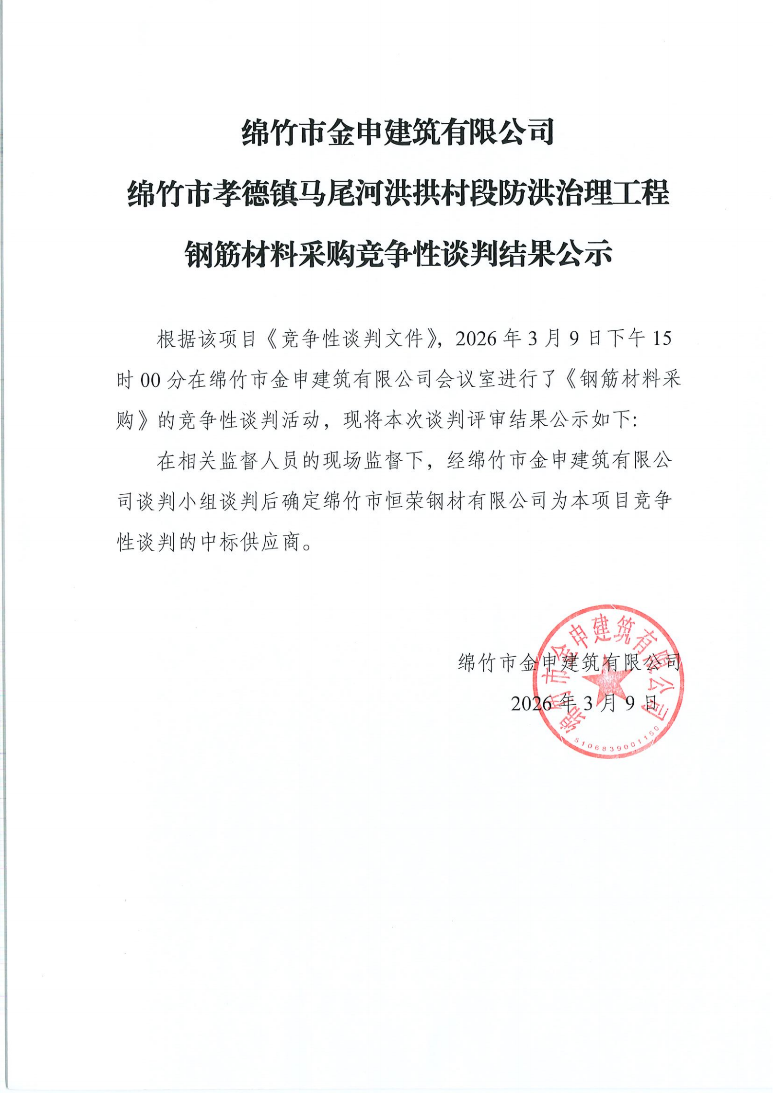 金申建筑关于绵竹市孝德镇洪拱村工程钢筋材料采购竞争性谈判结果公示