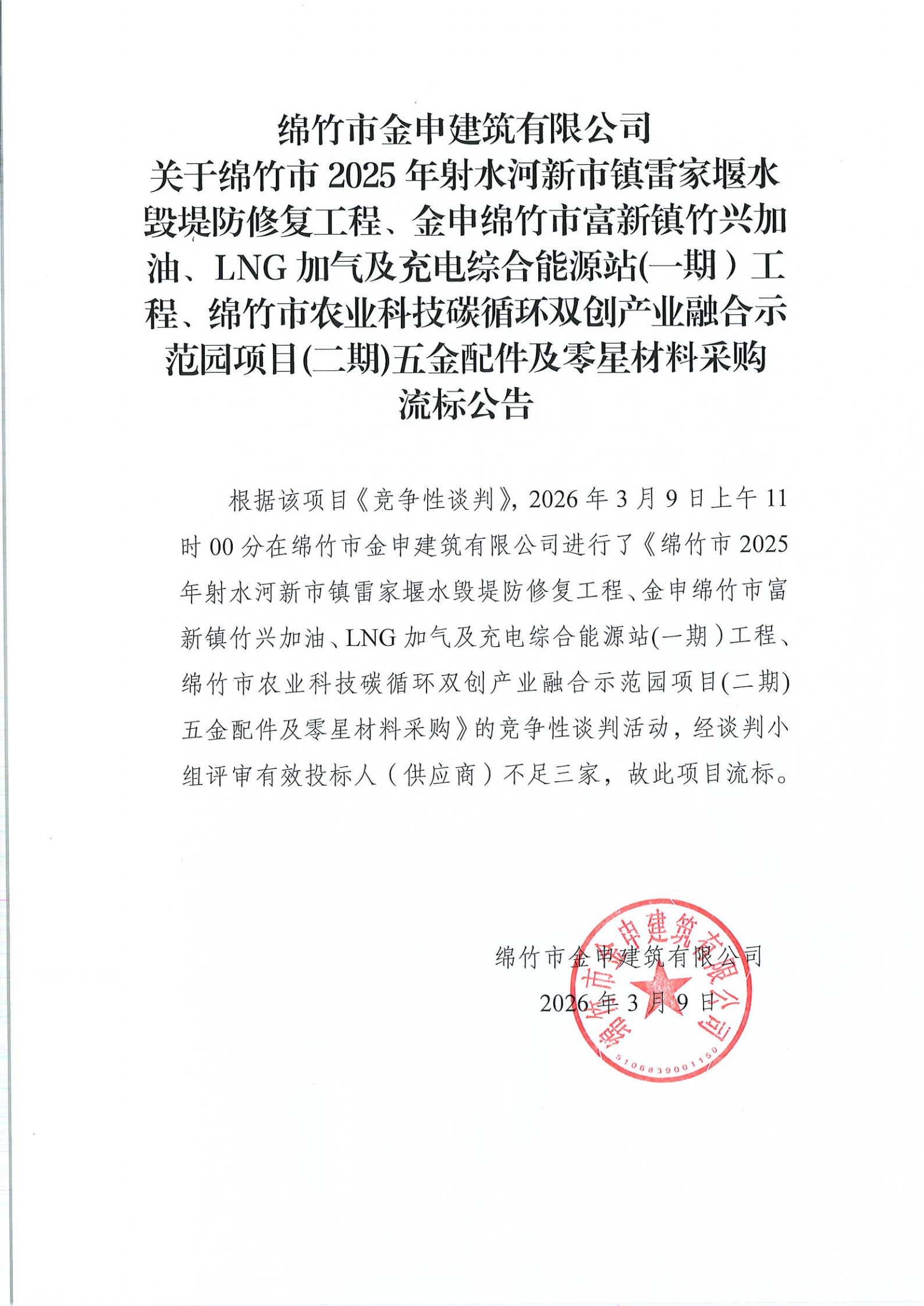 金申建筑关于射水河、能源站、碳循环三个项目五金配件及零星材料采购流标公告