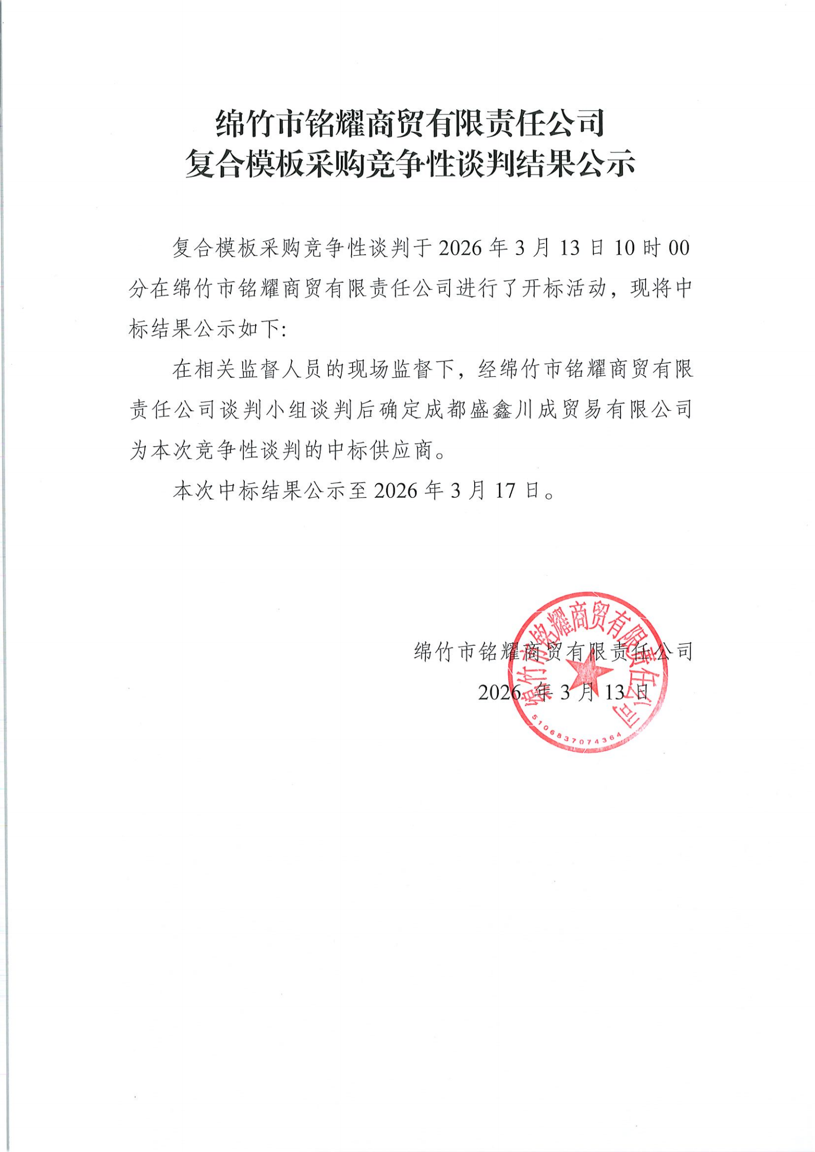 铭耀商贸复合模板采购竞争性谈判结果公示
