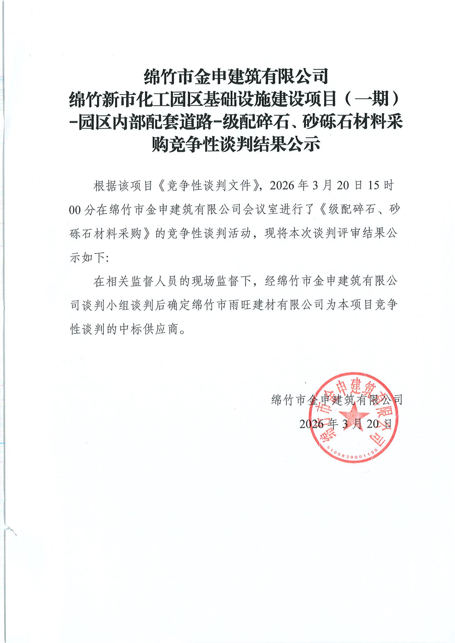 金申建筑关于新市园区内部道路级配碎石、砂砾石材料采购竞争性谈判结果公示