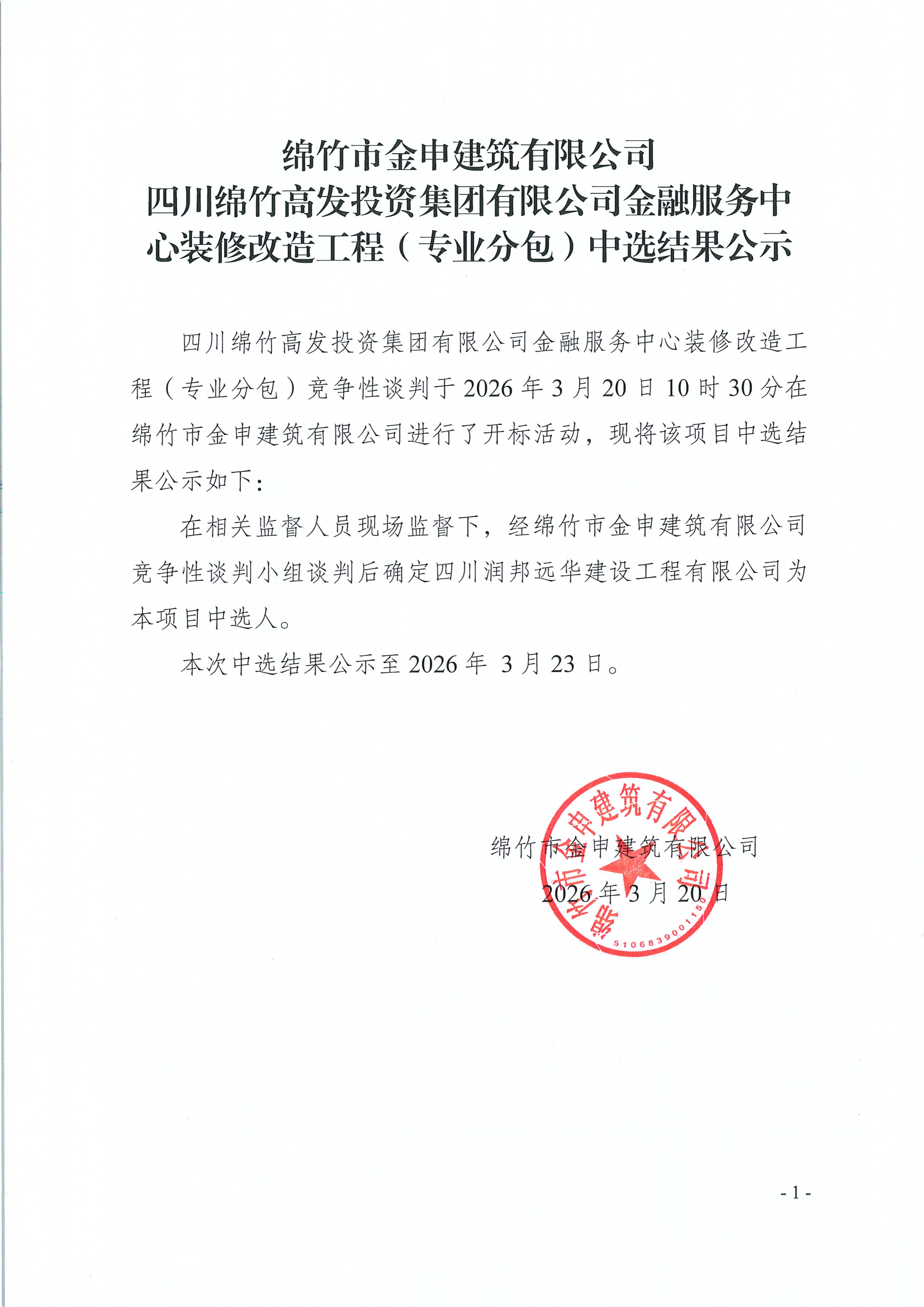 金申建筑关于高发装修改造(专业分包)中选结果公示