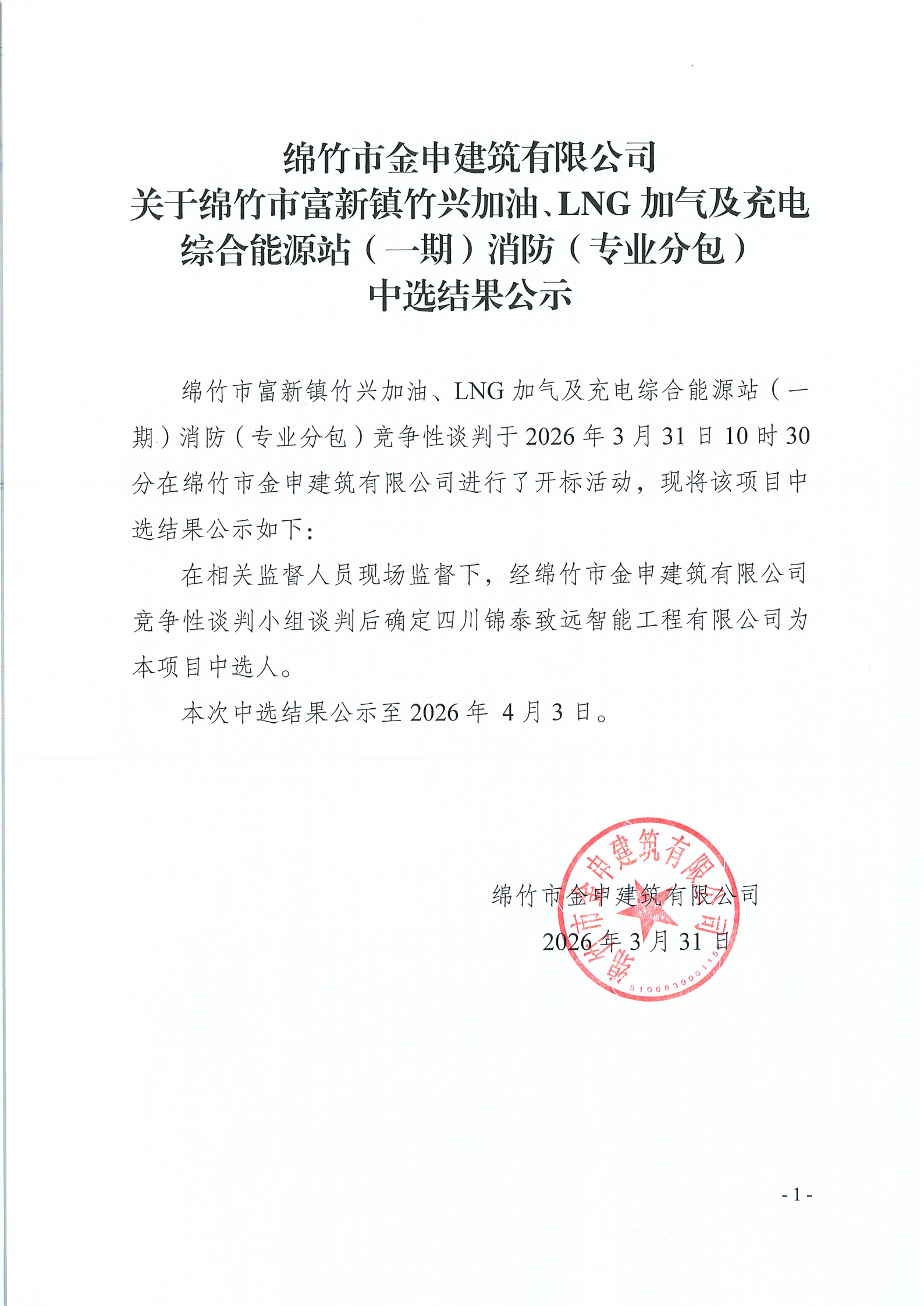 金申建筑关于绵竹市富新镇竹兴加油、LNG加气及充电综合能源站(一期)消防(专业分包)中选结果公示