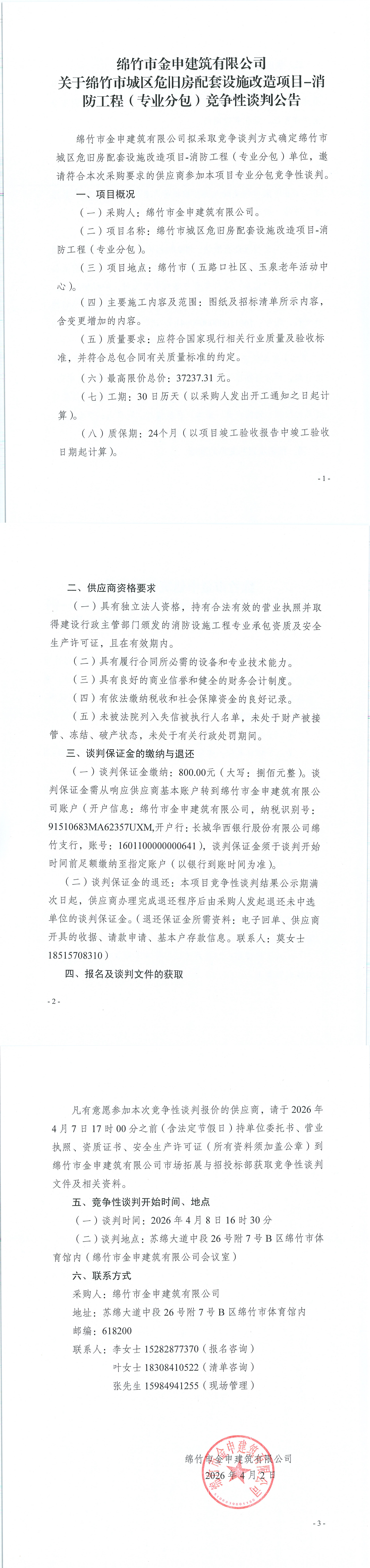 金申建筑关于绵竹市城区危旧房配套设施改造项目-消防工程(专业分包)竞争性谈判公告