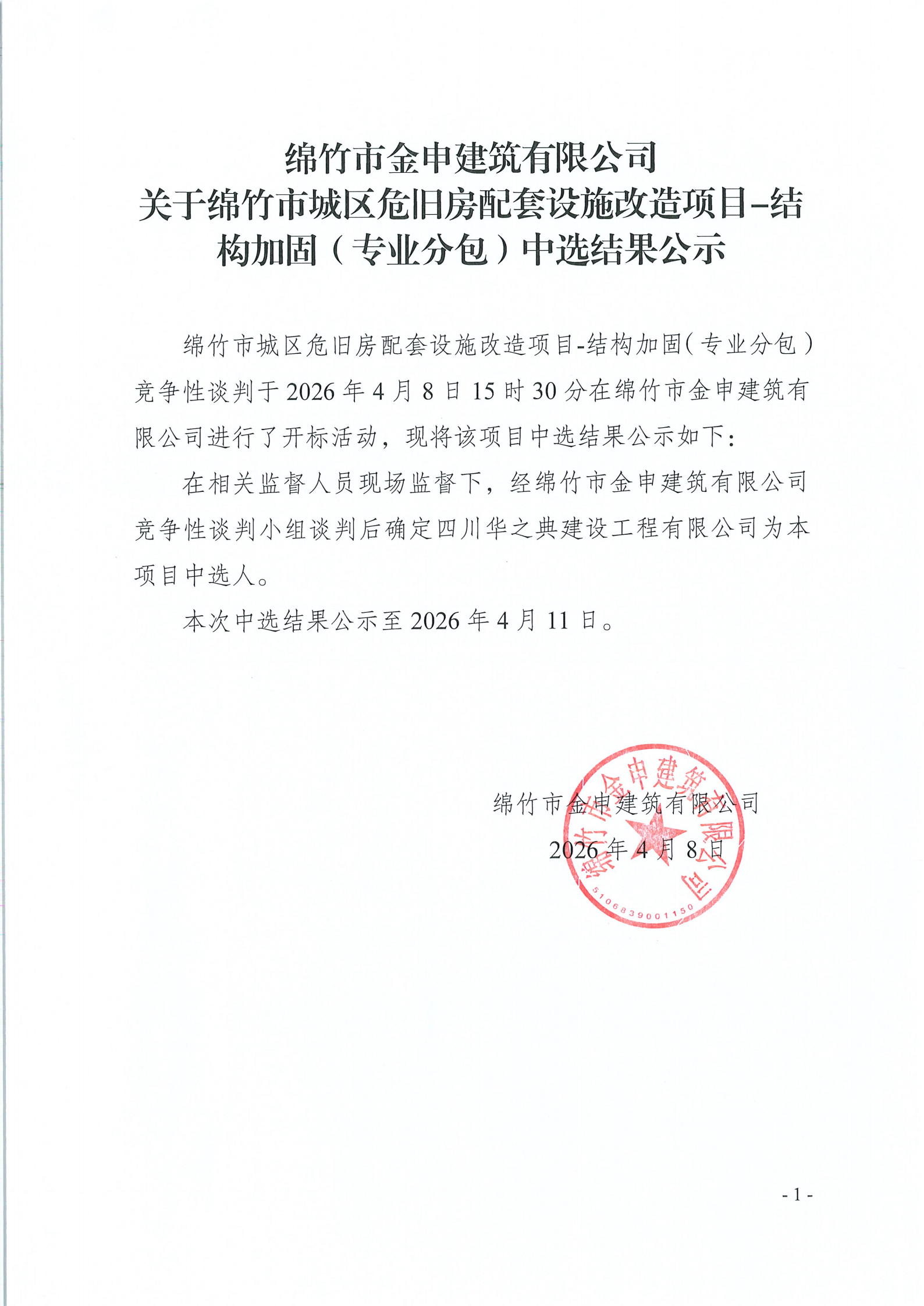 金申建筑关于绵竹市城区危旧房配套设施改造项目-结构加固(专业分包)中选结果公示