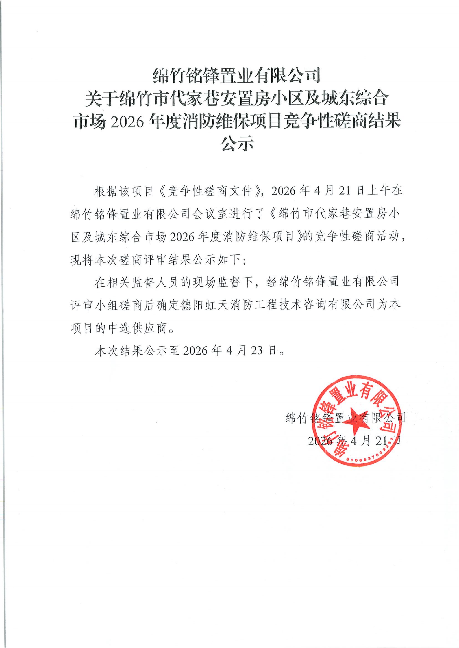 铭锋置业关于绵竹市代家巷安置房小区及城东综合市场2026年度消防维保项目竞争性磋商结果公示