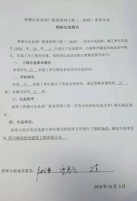 孝德污水处理厂配套管网工程劳务分包招标比选报告