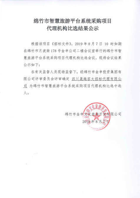 智慧旅游平台系统采购项目代理机构比选结果公示