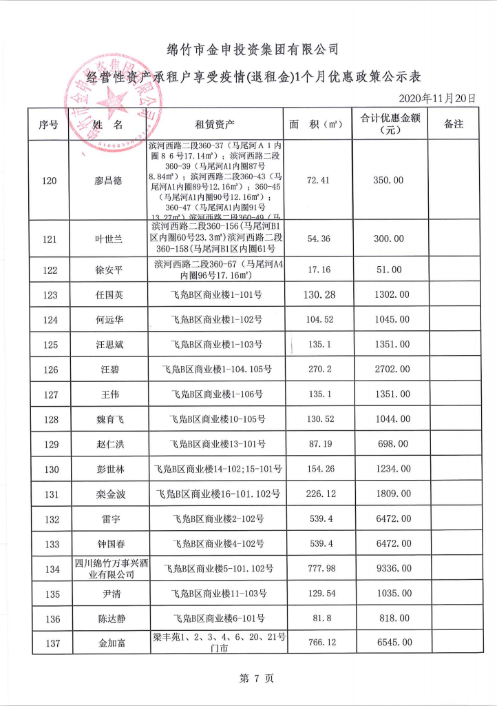 经营性资产承租户享受疫情(退租金)一个月优惠政策公示