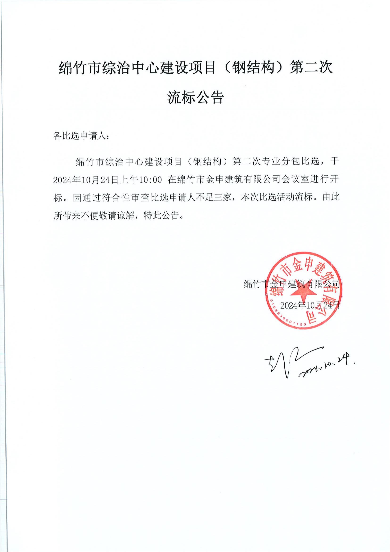 绵竹市综治中心建设项目(钢结构)第二次 流标公告