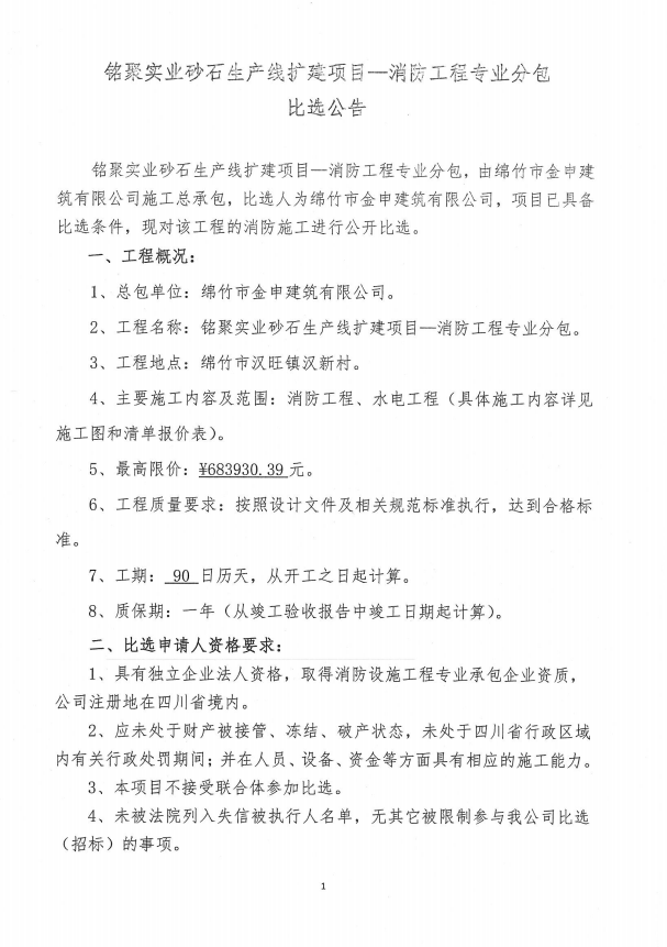 铭聚实业砂石生产线扩建项目—消防工程专业分包比选公告