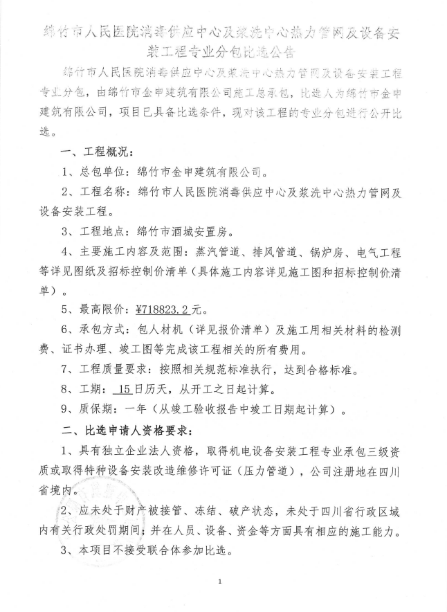 市医院消供、浆洗中心热力网管及设备安装工程比选公告