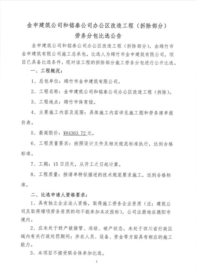 金申建筑和铭泰公司办公区改造工程劳务分包比选公告