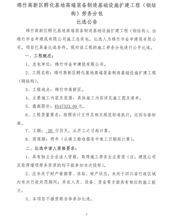 高新区高端装备制造基础设施(钢结构)劳务分包比选公告
