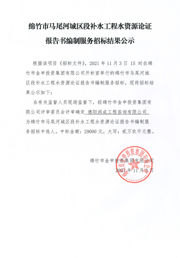 马尾河城区段补水工程水资源论证书编制服务招标结果公示