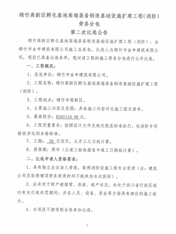 高端装备制造基础设施(消防)劳务分包二次比选公告