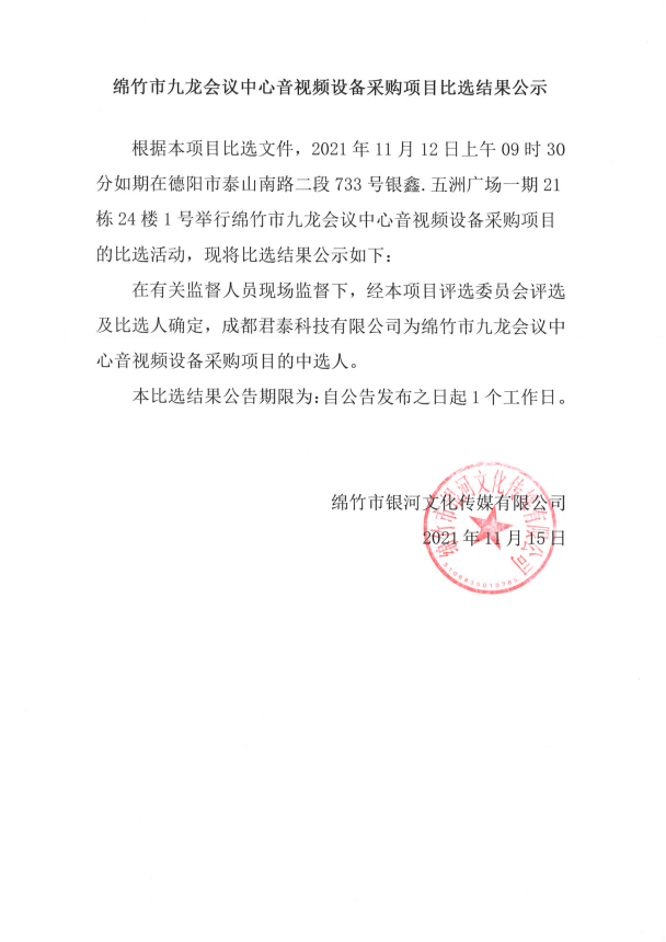 绵竹市九龙会议中心音视频设备采购项目比选结果公示