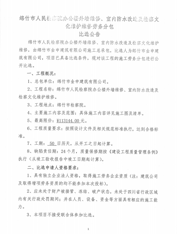 市检察院外墙维修、室内防水等改造维修工程比选公告