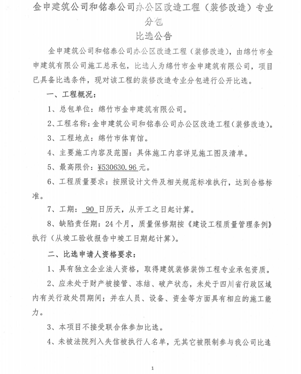 建筑和铭泰公司办公区改造工程劳务分包比选公告